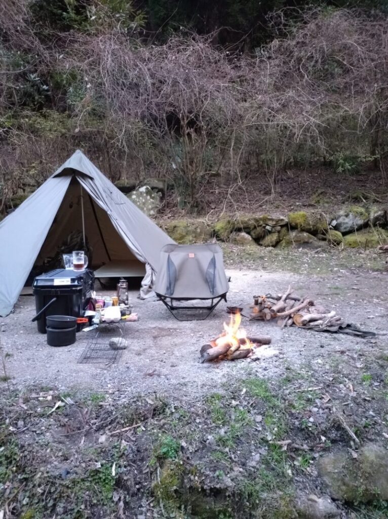 • 焚き火コンディション: 落ち着いた状態、風はまあまあ強め